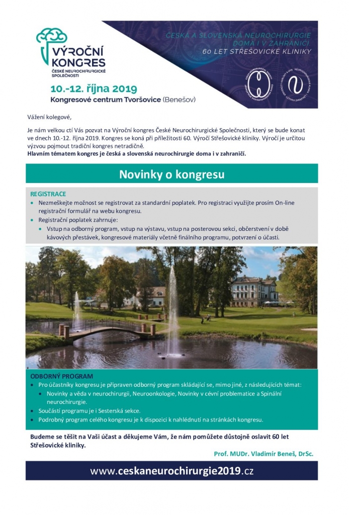 Výroční kongres České neurochirurgické společnosti Akce již proběhla. 10.10.2019 - 12.10.2019 + Kalendář Google+ Exportovat iCal